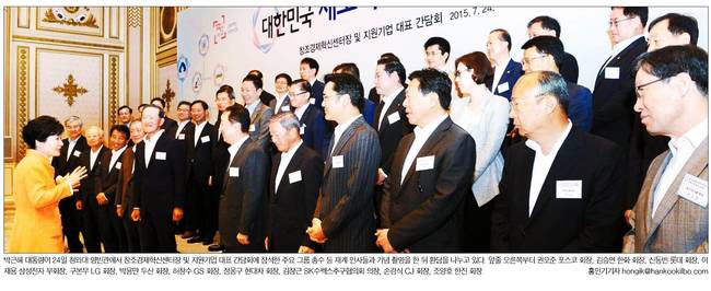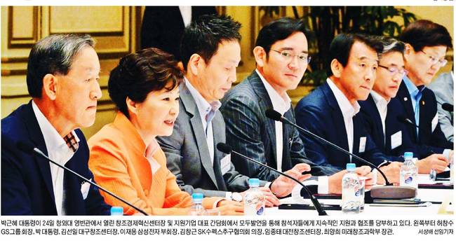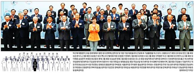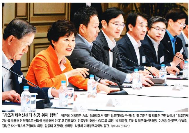 박근혜 대통령은 24일 창조경제혁신센터를 전담 지원하는 대기업 총수 17명과 창조경제혁신센터장을 청와대로 초청해 오찬간담회를 가졌다. 25일 대부분의 신문들은 전날 간담회의 모습을 1면 사진으로 실었다.