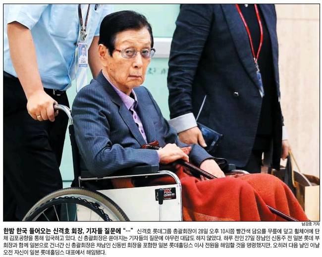 국민일보, 조선일보, 중앙일보는 신격호 롯데그룹 총괄회장이 28일 오후 10시10분쯤 서울 김포국제공항을 통해 일본에서 귀국하는 모습을 담았다.