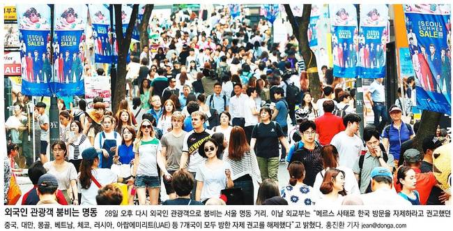 동아일보는 외국인 관광객으로 붐비는 명동의 모습을 전했다. 이날 외교부는 "메르스 사태로 한국 방문을 자제하라고 권고했던 중국, 대만, 몽골, 베트남, 체코, 러시아, 아랍에미리트 등 7개국이 모두 방한 자제 권고를 해제했다"고 밝혔다.