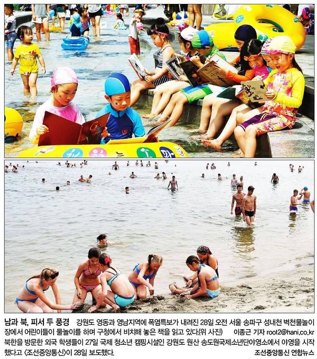 한겨레는 '남과 북, 피서 두 풍경'이란 1면 사진을 통해 강원도 영동과 영남지역에 폭염특보가 내려진 28일 오전 서울 송파구 성내천 벽천물놀이장에서 어린이들이 물놀이를 하며 구청에서 비치해 놓은 책을 읽는 장면과 북한을 방문한 외국 학생들이 27일 찍은 국제 청소년 캠핑시설인 강원도 원산 송도원국제소년단야영소 모습을 나란히 실었다.