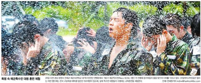 한국일보는 지난 28일 오전 경남 창원시 진해군 해군사관학교 내 특수전전단 연병장에서 '제3기 해군특수전 캠프'가 진행된 가운데 참가자들이 물을 맞으며 더위를 식히고 있는 장면을 담았다.