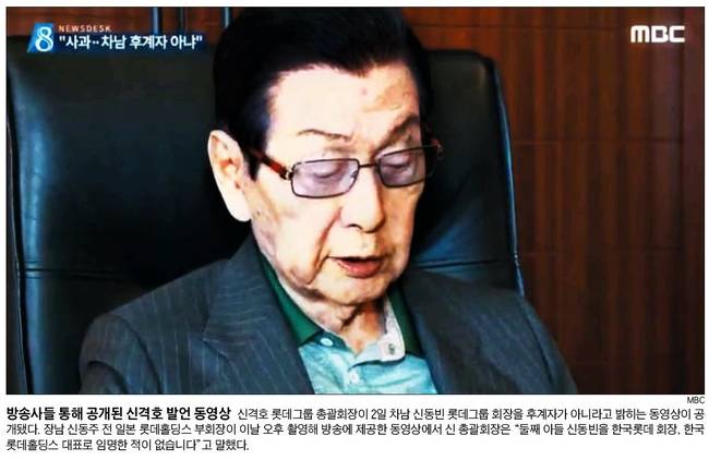 세계일보와 조선일보는 경영권을 놓고 형제간 분쟁이 불거진 롯데그룹 신격호 총괄회장의 대국민 사과영상 캡처 사진을 1면으로 보도했다.