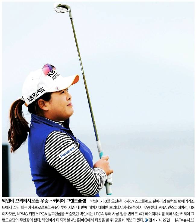 중앙일보는 브리티시여자오픈에서 우승하며 LPGA 투어 사상 일곱 번째로 4개 메이저대회를 제패하는 커리어 그랜드슬램의 주인공이 된 박인비의 모습을 1면 사진으로 담았다.