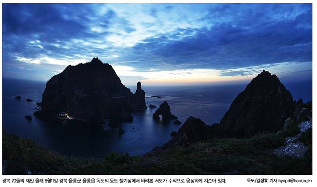 한겨레는 ‘광복·분단 70년 다시 쓰는 징비-독도에서 본 광복 70년’ 기획의 일환으로 독도의 모습을 1면 사진으로 실었다.