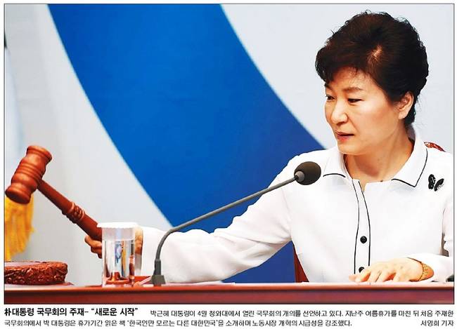 조선일보는 박 대통령이 국무회의를 주재하기 위해 회의장에 들어서고 있는 모습을 1면 사진으로 실으며 “박 대통령은 ‘연일 폭염으로 인해 잠 못 이루는 날들이 계속돼서 국민들, 특히 연로하신 분들의 건강이 걱정스럽다’며 이날 회의를 시작했다”고 전했다. 조선일보는 “박 대통령은 ‘문화 융성’ ‘노동 개혁’ 그리고 ‘내수 진작을 통한 경제 살리기’를 임기 후반기 국정 방향으로 제시하며 국정 운영에 본격 시동을 걸었다”며 “노동 개혁 강조도 잊지 않았다”고 보도했다.