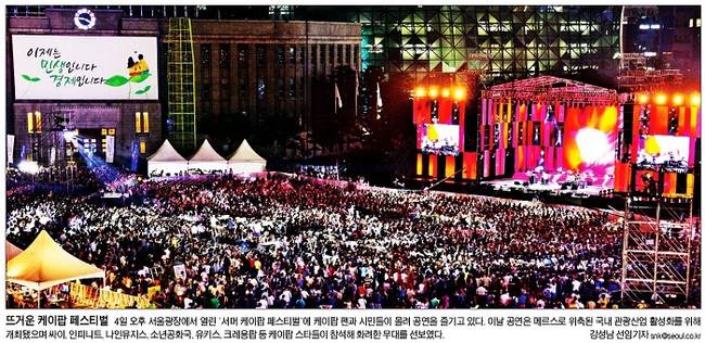 4일 서울 중구 세종대로 서울광장에서 열린 ‘서머 케이팝 페스티벌’에 주목한 신문도 있었다. 동아일보는 외국인들이 케이팝 스타들의 공연을 보고 있는 모습을 1면 사진으로 전하며 “이날 행사는 문화체육관광부와 한국관광공사가 내수 진작과 한국 홍보를 위해 기획했다”고 보도했다. 서울신문도 ‘서머 케이팝 페스티벌’에서 케이팝 팬과 시민들이 몰려 공연을 즐기고 있는 모습을 1면 사진으로 실으며 “이날 공연에는 싸이, 인피니트, 나인뮤지스, 소년공화국, 유키스, 크레용팝 등 케이팝 스타들이 참석해 화려한 무대를 선보였다”고 전했다.
