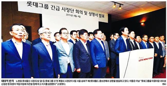 신동빈 롯데 회장의 대대적 반격을 1면 사진으로 담은 신문도 있었다. 세계일보는 노병웅 롯데물산 사장 등 롯데그룹 37개 계열사 사장단이 4일 서울 송파구 제2롯데월드 홍보관에서 성명을 발표하고 있는 모습을 1면 사진으로 게재하며 “이들은 이날 ‘롯데그룹을 이끌어갈 리더로 신동빈 현 회장이 적임자임에 의견을 함께 하고 지지를 표명한다’고 밝혔다”고 보도했다.