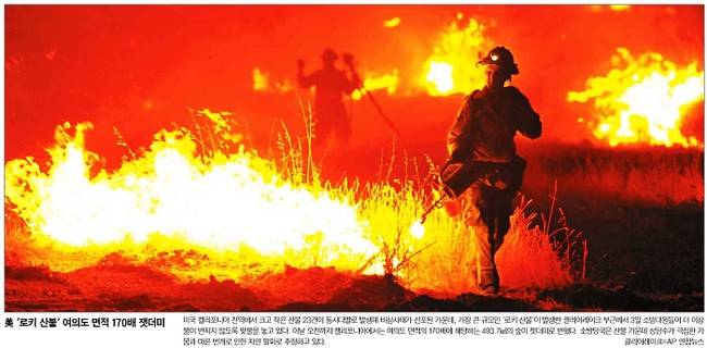 미국 로키 산불의 참상을 전한 신문도 있었다. 한국일보는 미국 캘리포니아 전역에서 크고 작은 산불 23건이 동시다발로 발생해 비상사태가 선포된 가운데, 가장 큰 규모인 ‘로키 산불’이 발생한 클리어레이크 부근에서 소방대원들이 더 이상 불이 번지지 않도록 맞불을 놓고 있는 모습을 1면 사진으로 전했다. 한국일보는 “이날 오전까지 캘리포니아에서는 여의도 면적의 170배에 해당하는 493.7㎢의 숲이 잿더미로 변했다”며 “소방당국은 산불 가운데 상당수가 극심한 가뭄과 마른 번개로 인한 자연 발화로 추정하고 있다”고 보도했다.