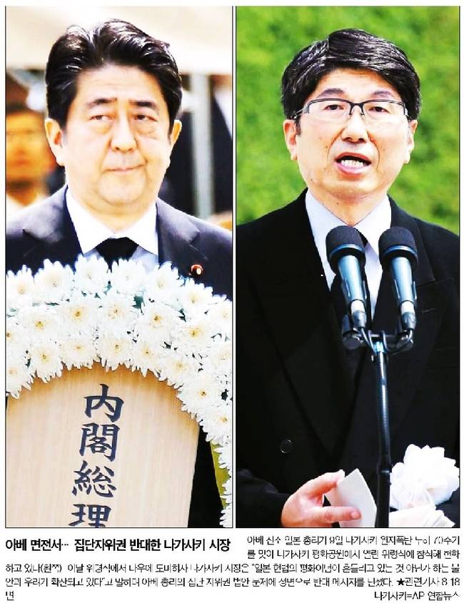 한국일보는 9일 나가사키 원자폭탄 투하 70주기를 맞아 나가사키 평화공원에서 열린 위령식에 참여한 아베 신조 일본총리와 이 자리에서 집단 자위권 법안 문제에 정면으로 반박한 도미히사 나가사키 시장의 사진을 나란히 1면에 걸었다.