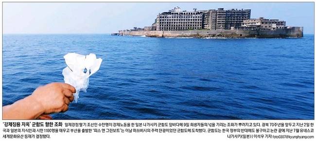 경향신문은 9일 일제 강점 말기 조선인 수만 명이 강제노동을 한 일본 나가사키 군함도 앞바다에서 희생자들의 넋을 기리는 모습을 1면에 담았다. 경향신문은 “광복 70주년을 앞두고 지난 2일 한국과 일본의 지식인과 시민 1100명을 태우고 부산을 출발한 ‘피스 앤 그린보트’는 이날 미쓰비시의 주력 탄광이었던 군함도에 도착했다”며 “군함도는 한국 정부의 반대에도 불구하고 논란 끝에 지난 7월 유네스코 세계문화유산 등재가 결정됐다”고 보도했다.