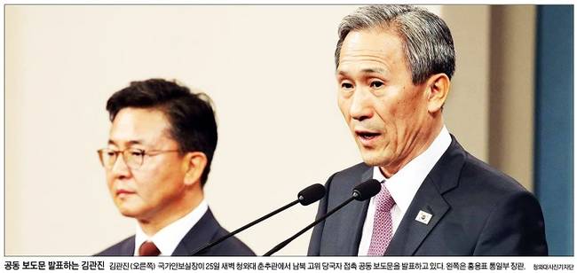 한국일보는 김관진 실장이 남북 고위급 접촉을 마치고 25일 오전 1시20분쯤 경기 파주시 통일대교에서 임진강을 건너오고 있는 모습을 1면 사진으로 게재했다. 한국일보는 “남북 대표단은 이견에도 불구하고 대화를 통해 문제를 해결하자는데 공감한 끝에 극적 타결에 이른 것으로 알려졌다”며 “특히 양측은 수차례 합의문 초안을 수정한 끝에 24일 정오께 접점을 마련한 것으로 알려졌다”고 보도했다.