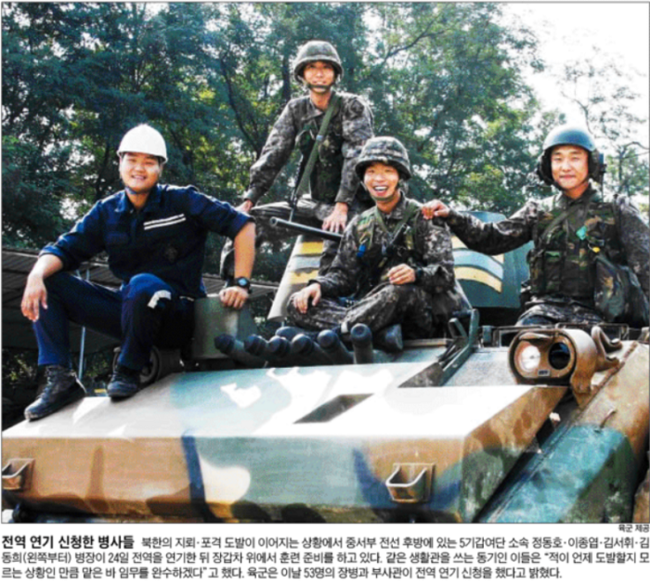 남북 간 군사적 긴장이 이어지는 가운데 병사들에 주목한 신문도 있었다. 조선일보는 이날 전역을 연기한 병사들의 모습을 1면 사진으로 실었다. 조선일보는 “북한의 지뢰·포격 도발이 이어지는 상황에서 중서부 전선 후방에 있는 5기갑여단 소속 정동호·이종엽·김서휘·김동희 병장이 24일 전역을 연기한 뒤 장갑차 위에서 훈련을 준비하고 있다”며 “같은 생활관을 쓰는 동기인 이들은 ‘적이 언제 도발할지 모르는 상황인 만큼 맡은 바 임무를 완수하겠다’고 했다”고 전했다.