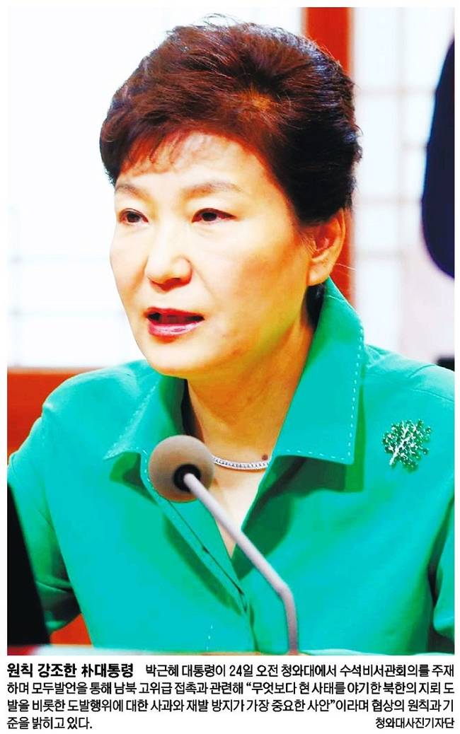 박근혜 대통령의 모습을 1면에 실은 신문도 있었다. 세계일보는 박 대통령이 24일 오전 청와대에서 수석비서관회의를 주재하며 모두발언을 하는 모습을 1면 사진으로 전했다. 세계일보는 “박 대통령은 남북 고위급 접촉과 관련해 ‘무엇보다 현 사태를 야기한 북한의 지뢰 도발을 비롯한 도발행위에 대한 사과와 재발 방지가 가장 중요한 사안’이라며 협상의 원칙과 기준을 밝혔다”고 보도했다.