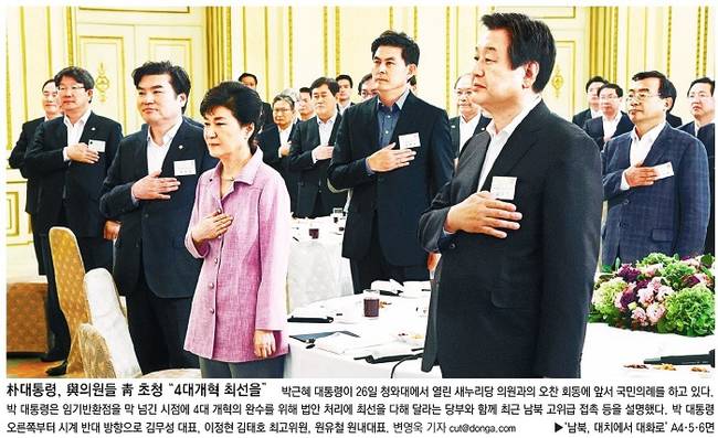 동아일보는 박 대통령이 청와대에서 열린 새누리당 의원과의 오찬 회동에 앞서 국민의례를 하고 있는 모습을 1면 사진으로 게재했다. 동아일보는 “박 대통령은 임기반환점을 막 넘긴 시점에 4대 개혁의 완수를 위해 법안 처리에 최선을 다해 달라는 당부와 함께 최근 남북 고위급 접촉 등을 설명했다”며 “박 대통령은 ‘일촉즉발의 긴박한 순간이었지만 또다시 국민 안위와 국가 안보가 위협을 받아서는 안 되기 때문에 끝까지 원칙을 갖고 임했다’고 말했다”고 전했다.