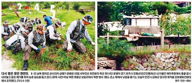 남북 합의 이후 다시 평온을 찾은 한반도 모습을 조명한 신문도 있었다. 세계일보는 8·25 남북 합의로 군사대치 상태가 완화된 26일 서부전선 최전방의 육군 제1사단 장병이 경기 파주시 민통선 내 마을인 해마루촌에서 총을 잠시 내려놓고 잡초 제거를 하며 농촌 일손을 돕고 있는 모습과 북한 개풍군 삼달리에서 북한 병사 1명이 초소 밖에서 낮잠을 즐기는 모습을 1면 사진으로 실었다.