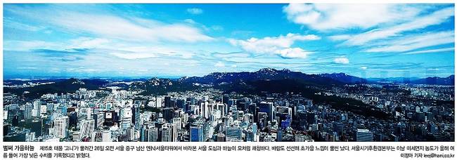 제15호 태풍 ‘고니’가 물러간 하늘이 쾌청해졌다. 한겨레는 ‘고니’가 물러간 26일 오전 서울 중구 남산 엔(N)서울타워에서 바라본 서울 도심과 하늘의 모습을 1면 사진으로 담았다. 한겨레는 “바람도 선선해 초가을 느낌이 물씬 났다”며 “서울시기후환경본부는 이날 미세먼지 농도가 올해 여름 들어 가장 낮은 수치를 기록했다고 밝혔다”고 전했다.
