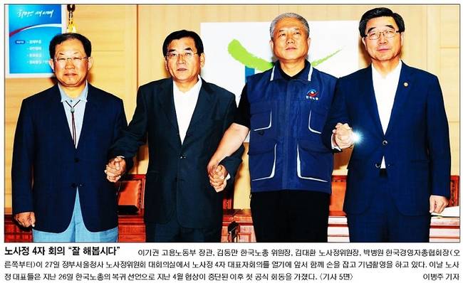 국민일보는 이기권 고용노동부 장관, 김동만 한국노총 위원장, 김대환 노사정위원장, 박병원 한국경영자총협회장이 27일 정부서울청사 노사정위원회 대회의실에서 노사정 4차 대표자회의를 열기에 앞서 함께 손을 잡고 기념촬영을 하고 있는 모습을 1면 사진으로 실었다. 국민일보는 “이날 회의에서 노사정은 한국노총 사무총장, 이동응 경총 전무, 고용부 고용선 차관, 최영기 노사정위 상임위원 등 차석 대표가 참여하는 4인 간사회를 매일 열어 이른 시일 내 주요 현안에 대한 접점을 찾기로 했다”며 “또 노동계가 요구해 온 공공기관 임금피크제 논의를 위한 ‘원포인트 협의체’도 꾸리기로 했다”고 보도했다.
