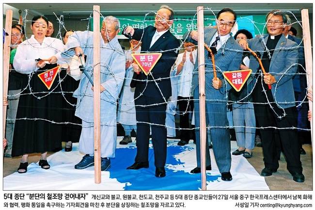 경향신문은 27일 서울 중구 한국프레스센터에서 개신교와 불교, 원불교, 천주교, 천도교 등 5대 종단 종교인들이 남북 화해와 협력, 평화 통일을 촉구하는 기자회견을 마친 후 분단을 상징하는 철조망을 자르고 있는 모습을 1면 사진으로 실었다. 경향신문은 5대 종단이 “분단의 철조망을 걷어내자”고 나섰다고 보도했다.
