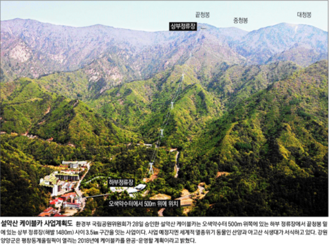 이날 경향신문은 설악산 케이블카 사업계획도를 1면 사진으로 내걸었다. 경향신문은 “환경부 국립공원위원회가 28일 승인한 케이블카는 오색약수터 500m 위쪽에 있는 하부 정류장에서 끝청봉 밑에 있는 상부 정류장(해발 1480m) 사이 3.5km 구간을 잇는 사업”이라며 “사업 예정지엔 세계적 멸종위기 동물인 산양과 아고산 식생대가 서식하고 있다. 강원 양양군은 평창동계올림픽이 열리는 2018년에 케이블카를 완공·운영할 계획이라고 밝혔다”고 전했다.