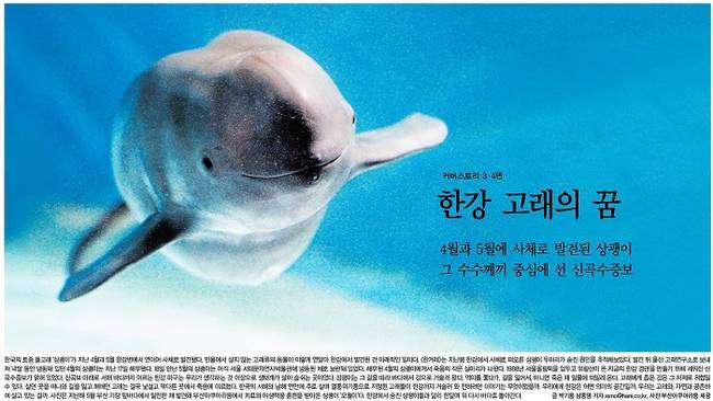 한겨레는 지난봄 한강에서 사체로 떠오른 상괭이 두 마리가 숨진 원인을 추적하며 지난해 5월 부산 기장 앞바다에서 탈진한 채 발견돼 부산아쿠아리움에서 치료와 야생적응 훈련을 받아온 상괭이 ‘오월이’의 사진을 1면에 내걸었다. 한겨레는 “발견 뒤 울산 고래연구소로 보내져 넉 달 동안 냉동돼 있던 4월의 상괭이는 지난 17일 해부됐다. 거기에서 죽음의 작은 실마리가 나왔다”며 “1988년 서울올림픽을 앞두고 유람선이 뜬 지금의 한강 경관을 만들기 위해 세워진 신곡수중보가 얽혀 있었다. 신곡보 아래로 서해 바다까지 이르는 한강 하구는 우리가 생각하는 것 이상으로 생태계가 살아 숨 쉬는 곳이었다”고 전했다.