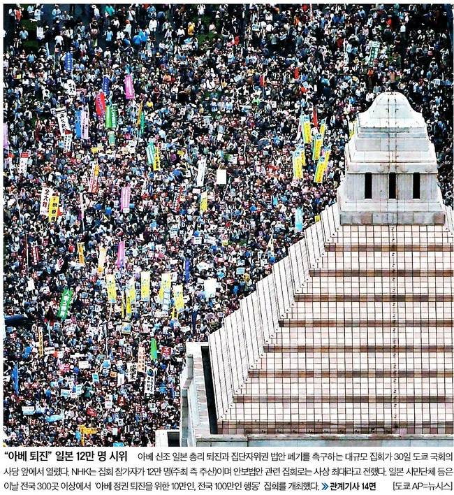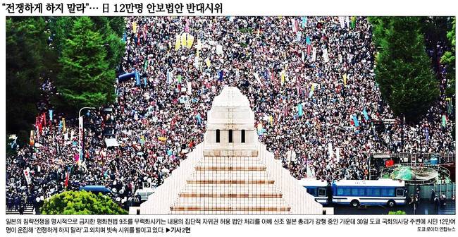 아베 신조 일본 정권이 밀어붙이고 있는 안보법안에 반대하는 대규모 시위가 30일 일본 전역에서 벌어졌다. 도쿄 국회의사당 주변에서 열린 시위에는 12만여 명이 참여한 것으로 알려졌으며 도쿄 외 전국 300여 곳에서도 사람들이 모여들었다. 이날 대부분의 신문은 이 모습을 1면 사진으로 보도했다.