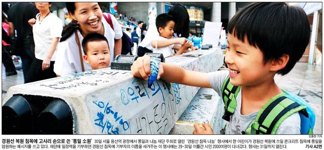 조선일보는 30일 서울 용산역 광장에서 통일과 나눔 재단 주최로 열린 ‘경원선 침목 나눔’ 행사에서 한 어린이가 경원선 복원에 쓰일 콘크리트 침목에 통일을 염원하는 메시지를 쓰고 있는 모습을 1면 사진으로 담았다.