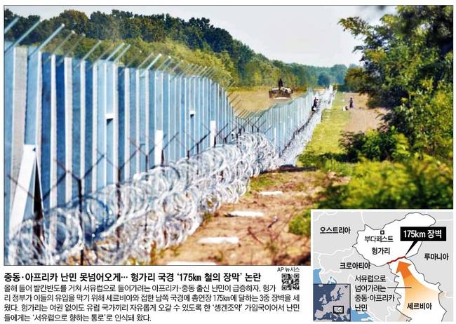 조선일보는 “올해 들어 발칸반도를 거쳐 서유럽으로 들어가려는 아프리카·중동 출신 난민이 급증하자 헝가리 정부가 이들의 유입을 막기 위해 세르비아와 접한 남쪽 국경에 총연장 175km에 달하는 3중 장벽을 세웠다”며 “헝가리는 여권 없이도 유럽 국가끼리 자유롭게 오갈 수 있도록 한 ‘