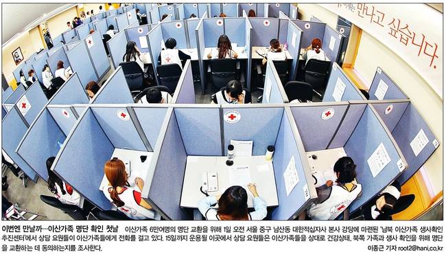 한겨레는 이산가족 6만여 명의 명단 교환을 위해 1일 서울 중구 남산동 대한적십자사 본사 강당에 마련된 ‘남북 이산가족생사확인추진센터’에서 상담 요원들이 이산가족들에게 전화를 걸고 있는 모습을 1면에 실으면서 “15일까지 운용될 이곳에서 상담 요원들은 이산가족들을 상대로 건강상태, 북쪽 가족과 생사 확인을 위해 명단을 교환하는 데 동의하는지를 조사한다”고 설명했다.