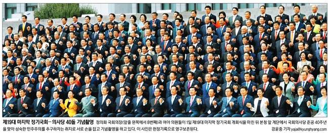 경향신문은 제19대 마지막 정기국회 개회식을 마친 1일 국회 본청 앞 계단에서 정의화 국회의장과 여야 의원들이 국회의사당 준공 40주년 기념 촬영을 하는 모습을 1면에 담았다. 경향신문은 “(국회의원들은) 성숙한 민주주의를 추구하자는 취지로 서로 손을 잡고 기념 촬영했다”며 “이 사진은 헌정기록으로 영구보존된다”고 전했다.