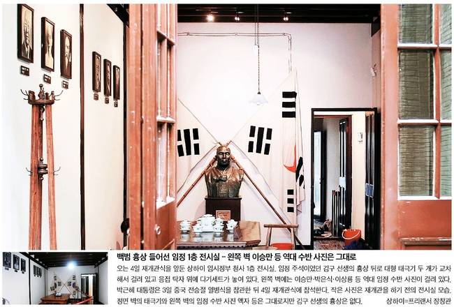 중앙일보는 오는 4일 재개관식을 앞둔 상하이 임시정부 청사 1층 전시실에 임정 주석이었던 김구 선생의 흉상과 그 뒤로 대형 태극기 두 개가 교차해 걸려 있는 사진을 1면에 실었다. 중앙일보는 “중국 정부가 상하이 임시정부 청사 재개관을 준비하며 청사 안에 한·중 공동 항일투쟁의 중요성을 강조한 김구 당시 주석의 기고문을 전시한다고 여권 관계자가 말했다”며 “임정 청사 개·보수 예산 전액(7억원)을 중국 정부가 부담한 것에 대해 아주대 김흥규 중국정책연구소장은 “한국과 중국 간 공감대 확대를 위한 중국의 공공외교”라고 말했다”고 전했다.