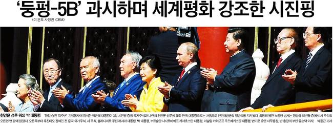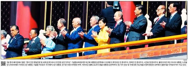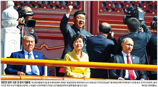박근혜 대통령이 3일 중국 베이징 톈안먼 광장에서 열린 ‘항일전쟁 및 세계 반파시스트 전쟁 승전 70주년(전승절)’ 기념식에 참석했다. 대한민국 대통령이 톈안먼 성루에 선 것은 박 대통령이 처음이다. 박 대통령은 푸틴 러시아 대통령에 이어 시진핑 중국 국가주석의 오른쪽 두 번째에 자리했다. 4일 대부분의 신문은 이 모습을 1면 사진으로 보도했다.