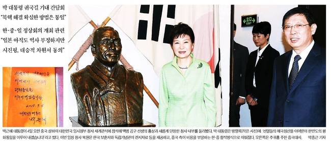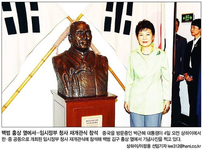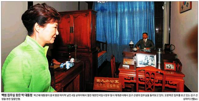 박근혜 대통령이 2박3일간의 중국 방문을 마치고 귀국했다. 앞서 박 대통령은 상하이 대한민국임시정부 청사 재개관식에 참석했다. 5일 대부분의 신문들은 임시정부를 찾은 박 대통령의 모습을 1면 사진으로 내걸며 중국 방문 성과를 분석했다.