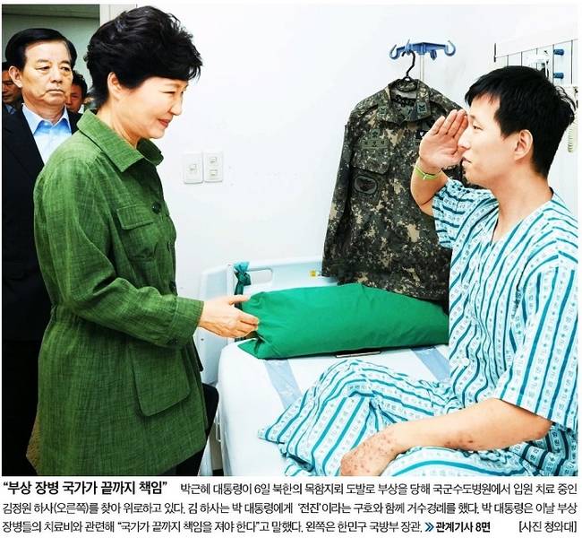 중앙일보는 박근혜 대통령이 목함지뢰 도발로 부상을 당해 국군수도병원에서 입원치료 중인 김정원 하사를 찾아 위로하는 모습을 1면에 걸었다. 중앙일보는 사진설명을 통해 “김 하사는 박 대통령에게 ‘전진’이라는 구호와 함께 거수경례를 했다. 박 대통령은 이날 장병들의 치료비와 관련해 ‘국가가 끝까지 책임을 져야 한다’고 말했다고” 전했다. 중앙일보는 관련기사에서 “두 다리가 잘린 하 하사는 부상 정도가 심해 민간병원에서 치료를 받아왔다. 현행법은 민간병원에서 치료받을 경우 공무상 요양비 지급기간을 최장 30일로 제한하고 있다”며 “논란이 일자 국방부는 5일 ‘하 하사의 치료비를 전액 부담하겠다’고 밝혔다”고 전했다.