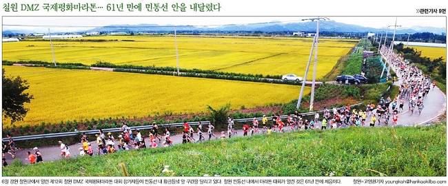 한국일보는 지난 6일 강원 철원군에서 열린 ‘철원 DMZ 국제평화마라톤 대회의 모습을 대문사진으로 걸었다. 한국일보는 관련기사에서 “'제12회 철원DMZ국제평화마라톤'대회가 6일 철원군 철원읍 월정리역 DMZ평화문화광장 일원 비무장지대(DMZ)코스에서 7000여명이 참가한 가운데 열렸다”며 “특히 이날 대회는 휴전서 철책이 생긴지 61년만에 처음으로 모든 참가자에게 중부전선 최북단 민간인 통제구역의 속살이 개방돼 의미를 더했다”고 전했다.
