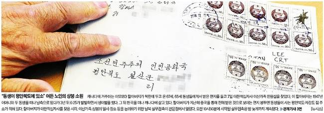 중앙일보는 남북 적십자 회담과 관련해 캐나다에 거주 중인 이모(80) 할아버지가 북한에 두고 온 두 동생에게 전하는 편지 봉투의 모습을 1면 사진으로 선택했다. 중앙일보는 사진설명에서 “캐나다에 거주하는 이 모(80) 할아버지가 북한에 두고 온 67세, 65세 동생들에게 받은 편지를 들고 7일 대한적십자사 이산가족 민원실을 찾았다. 이 할아버지는 1947년 어머니와 두 동생을 떠나 남쪽으로 왔다가 3년 뒤 6.25가 발발하면서 생이별을 했다. 그 뒤 한국을 떠나 캐나다에 살고 있다. 할아버지가 지난해 중국을 통해 전해받은 것으로 보이는 편지봉투엔 동생들이 사는 평안북도 자강도 집주소가 적혀있다”고 설명했다.