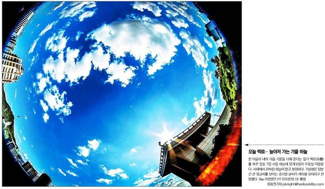 한국일보는 절기상 백로를 하루 앞둔 7일 서울 하늘의 모습을 1면에 담았다. 한국일보는 사진설명을 통해 “찬 이슬이 내려 가을 기운을 더해 준다는 절기 백로를 하루 앞둔 7일 서울 하늘에 뭉게구름이 두둥실 떠올랐다. 시내에서 관측된 하늘이 맑고 청명하다”며 “기상청은 당분간 큰 일교차를 보이는 초가을 날씨가 계속될 것이라고 전망했다”고 보도했다.
