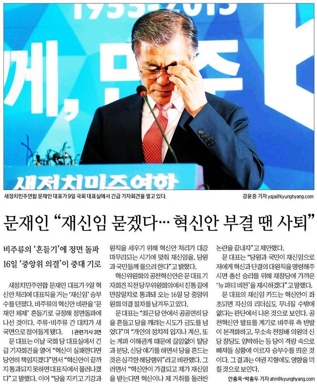경향신문은 10일 1면 사진기사로 새정치민주연합 문재인 대표가 지난 9일 국회 당 대표실에서 긴급 기자회견을 열고 있는 장면을 실었다.