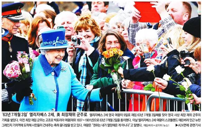 동아일보, 한국일보는 엘리자베스 2세 영국 여왕이 9일로 재임 63년 7개월 3일째를 맞아 영국 사상 최장 재위 군주의 기록을 쌓았다며 이날 엘리자베스 2세 여왕이 스코틀랜드 에든버러 인근 뉴턴그레인지 기차역에 도착해 ▲서울신문