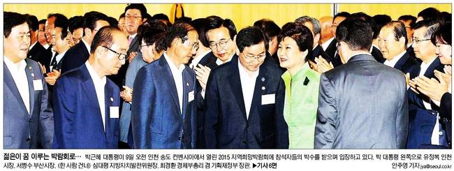 서울신문은 박근혜 대통령이 9일 오전 인천 송도 컨벤시아에서 열린 2015 지역희망박람회에 참석자들의 박수를 받으며 입장하는 모습을 담았다.