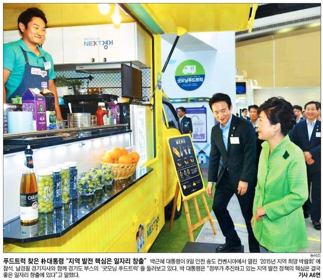 조선일보도 박 대통령이 9일 인천 송도 컨벤시아에서 열린 '2015년 지역희망박람회'에 참석, 남경필 경기지사와 함께 경기도 부스의 '굿모닝 푸드트럭'을 둘러보고 있는 장면을 전했다.
