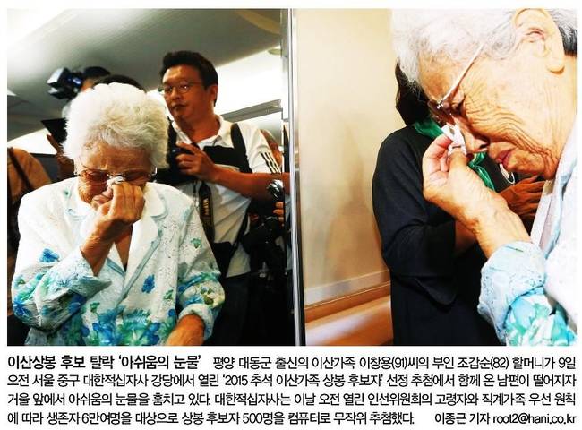 한겨레는 평양 대동군 출신의 이산가족 이창용(91)씨의 부인 조갑순(82) 할머니가 9일 오전 서울 중구 대한적십자 강당에서 열린 '2015 추석 이산가족 상봉 후보자' 선정 추첨에서 함께 온 남편이 떨어지자 거울 앞에서 아쉬움의 눈물을 훔치고 있는 모습을 담았다.