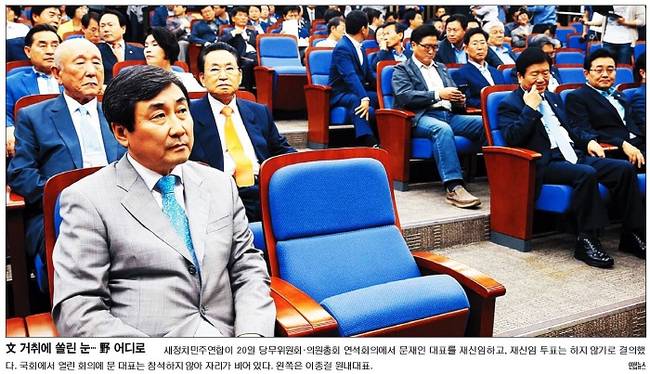 새정치민주연합이 20일 당무위원회·의원총회 연석회의에서 문재인 대표를 재신임하고, 재신임 투표는 하지 않기로 결의했다. 국민일보는 국회에서 열린 회의에 문 대표가 참석하지 않아 자리가 비어 있는 모습을 1면 사진으로 전했다. 국민일보는 “문 대표가 재신임 투표를 철회하는 쪽에 무게를 두고 고민을 시작한 이유는 중진 의원 등 당 구성원들의 ‘절박함’이 전달됐기 때문인 것으로 보인다”며 “비주류 의원들이 회의를 ‘보이콧’하면서 결과에 승복하지 않을 것임을 시사했지만 다수의 당 구성원들이 중진회의, 중앙위원회, 당무위원회·의원총회 연석회의 등 세 차례에 걸쳐 거듭 철회를 요청한 사실을 외면하기 힘들다는 분석”이라고 보도했다.