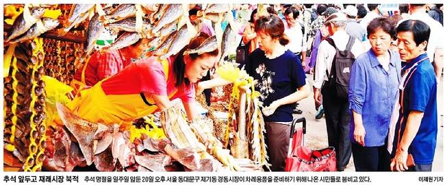 추석 명절을 앞두고 재래시장이 북적이는 모습을 1면에 담은 신문도 있었다. 세계일보는 추석 명절을 일주일 앞둔 20일 오후 서울 동대문구 제기동 경동시장의 모습을 전하며 “차례용품을 준비하기 위해 나온 시민들로 붐비고 있다”고 보도했다.