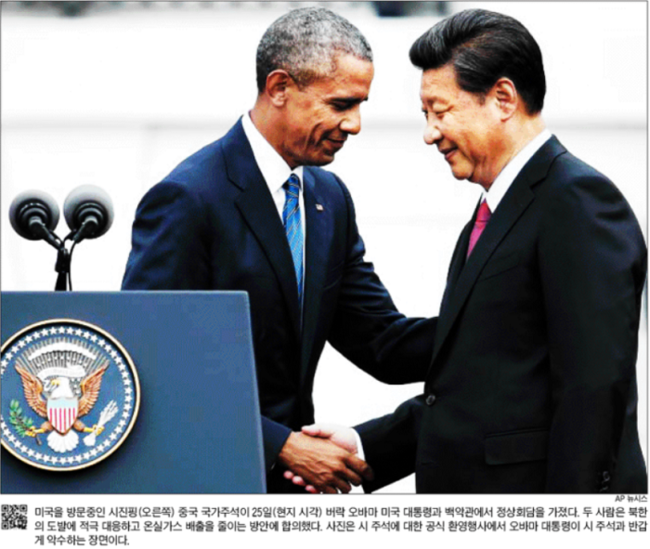 동아일보는 오바마 대통령이 25일 백악관 오벌오피스에서 미중 정상회담을 시작하면서 시진핑 주석과 악수하고 있는 모습을 1면 사진으로 실었다.