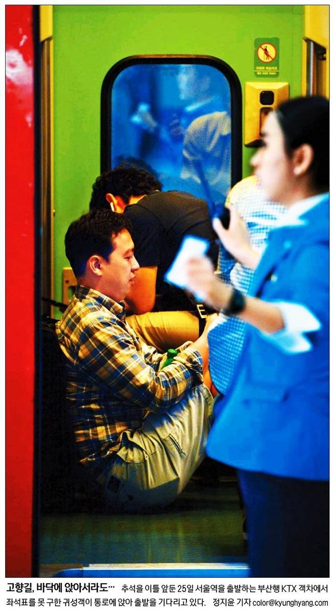 민족 최대의 명절 추석 연휴가 시작됐다. 일부 신문들은 들뜬 귀성객들의 모습을 1면 사진으로 실으며 ‘집에 간다’는 설렘을 전했다. 경향신문은 ‘고향길, 바닥에 앉아서라도…’라는 제목으로 추석을 이틀 앞둔 25일 서울역을 출발하는 부산행 KTX 객차에서 좌석표를 못 구한 귀성객이 통로에 앉아 출발을 기다리고 있는 모습을 1면 사진으로 전했다.