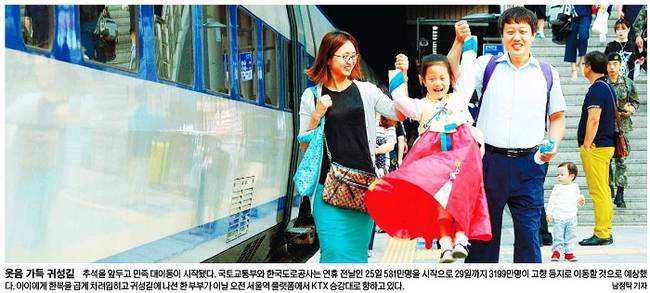 세계일보도 ‘웃음 가득 귀성길’이라는 제목으로 아이에게 한복을 곱게 차려 입히고 귀성길에 나선 한 부부가 이날 오전 서울역 플랫폼에서 KTX 승강대로 향하고 있는 모습을 1면 사진으로 담았다. 세계일보는 “추석을 앞두고 민족 대이동이 시작됐다”며 “국토교통부와 한국도로공사는 연휴 전날인 25일 581만명을 시작으로 29일까지 3199만명이 고향 등지로 이동할 것으로 예상했다”고 전했다.