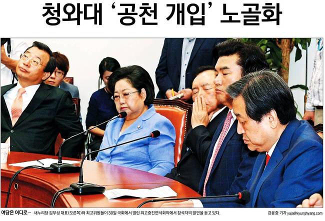경향신문은 “청와대의 ‘비토’는 공천기법이 아닌 여권 내 정치적 이해 문제로 연결되면서 파문이 확산됐다…새누리당에선 청와대의 공천개입 논란을 넘어 김무성 대표 찍어내기 등 당 권력 접수 수순의 신호탄으로 받아들였다”며 “여당에선 “청와대가 숨겼던 발톱을 드러냈다”는 말이 나왔고, 그간 공천개입설 등에 ‘찌라시’, ‘소설’이라고 부인하던 청와대가 본심을 드러냈다는 것…특히 김 대표가 ‘오픈프라이머리에 정치생명을 걸겠다’고 한 점을 감안하면, 청와대가 대표를 그만두라는 메시지를 던진 것이란 해석도 들린다”고 보도했다.