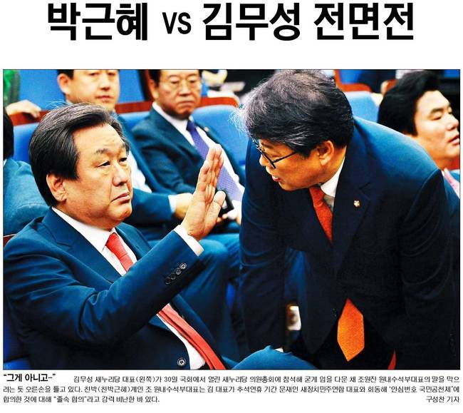 조선일보는 “당·청이 내년 4월 총선 공천 문제를 놓고 정면충돌로 향하는 양상이다…겉으론 제도의 공정성을 놓고 다투는 듯하지만 본질은 공천 주도권을 누가 잡느냐를 놓고 벌이는 갈등이라는 게 정치권의 공통된 분석”이라며 “청와대 관계자들은 '김 대표가 정치생명까지 건 ‘오픈프라이머리’가 물 건너가고 가족 문제(사위의 마약 사건)으로 곤란해진 데 이어 이번 뉴욕 순방에서 (대통령이) 반기문 유엔 사무총장을 여러 번 만난 것을 정치적으로 해석해 초조해진 것 아닌가 싶다'고 했다”고 전했다.
