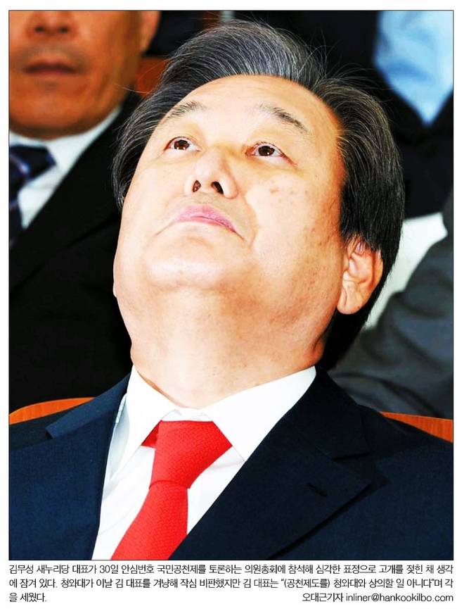 한국일보는 “여의도 정치권에서는 ‘김의 전쟁’ 서막이 올랐다는 얘기가 나온다…김 대표는 5선의 중진이지만 항상 그의 앞에는 ‘YS(김영삼 전 대통령)의 측근’, ‘박근혜의 남자’ 등 거물 정치인의 이름이 따라다녔다”며 “비박계 한 재선 의원은 '김 대표에게 국민공천제는 자신이 지켜야 할 정치적 '마지노선'이자 대선주자로서 이제야 진정한 의미의 ‘자기 정치’를 시작하는 출발점으로 느껴졌다'고 말했다”고 보도했다.