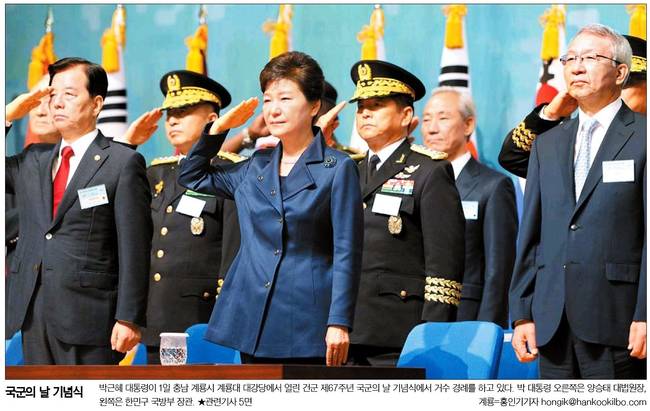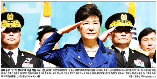 박근혜 대통령이 지난 1일 충남 계룡대에서 열린 ‘건군 67주년 국군의 날 기념식’에 참석해 북한이 대결이 아닌 대화의 장에 나와야 한다고 촉구했다. 2일 대부분의 종합일간지는 전날 행사에 참석한 박 대통령의 모습을 1면 사진에 담았다.